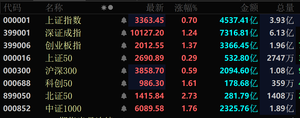 今日,A股强势反弹,北证50指数涨逾2%,收复1400点,创业板指亦涨超1%,再度回到2000点上方,上证50则一度冲击2700点整数关口。超4400只个股上涨,成交温和放大至1.21万亿元。