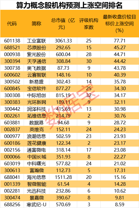 机构关注度方面,中际旭创、天孚通信、紫光股份、工业富联、中科曙光、浪潮信息等9股关注度较高,中际旭创超30家机构评级 。最新收盘价较机构一致预测目标价来看,12股未来股价上涨空间有望超30%。其中工业富联预测上涨空间高达77.71%,芯原股份、紫光股份、天孚通信、奥飞数据、云赛智联预测上涨空间超40%。