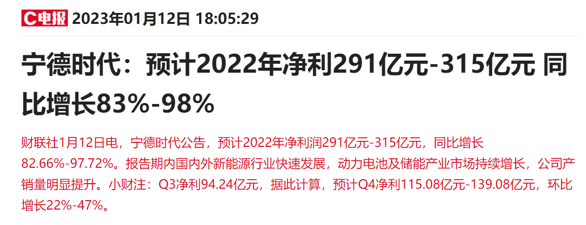 总市值超1万亿元的全球动力电池龙头宁德时代晚间公告,预计2022年净利润291亿元-315亿元,同比增长82.66%-97.72%。