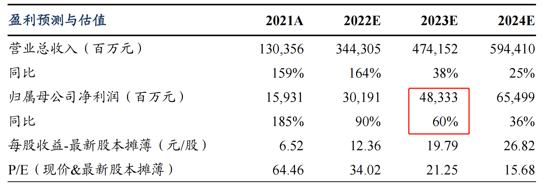 考虑到行业旺盛需求及公司全球龙头地位稳固,陈睿彬预计宁德时代2023年实现净利润483亿元,同比增长60%。
