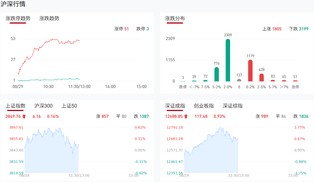 市场早盘震荡反弹,创业板领涨,宁德时代涨超11%。沪深两市半日成交额1.85万亿,较上个交易日放量632亿。盘面上热点较为杂乱,个股跌多涨少,全市场超3200只个股下跌。从板块来看,固态电池概念股集体大涨,先导智能等多股涨停。白酒等大消费股震荡反弹,会稽山等涨停。大金融股一度冲高,新华保险再创历史新高。下跌方面,芯片股展开调整,寒武纪等多股跌超5%。