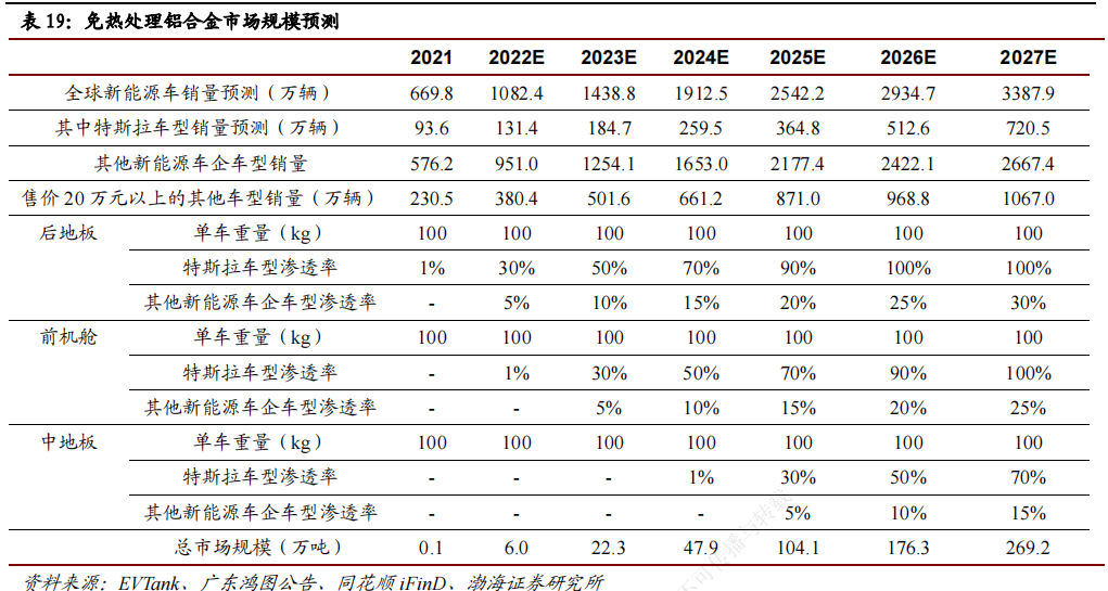 目前,一体化压铸尚处发展初期,产业链各环节协同材料端共同发展,下游车企应用上,呈现特斯拉引领,其他车企跟进态势。据机构测算,预计2027年全球新能源车的免热处理铝合金需求量将达到269.2万吨,2022-2027年CAGR为88.6%,市场规模有望快速增长,且增速高于新能源汽车销售增速。