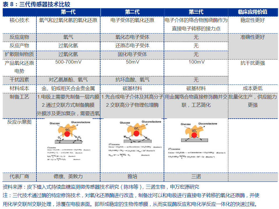 公司CGM采用的是第三代直接电子转移技术,通过修饰葡萄糖氧化酶,使之直接具有电子传递的功能,该技术不依赖于电子传递介质,葡萄糖氧化效率高,具有低电位、不依赖氧气、干扰物少、更好的稳定性和准确性等优点。该项技术已获得国内的发明专利授权,并通过PCT申请了欧洲、美国、日本、韩国等国家发明专利。