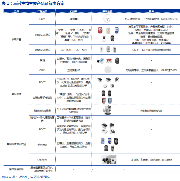 三诺生物:公司是国内最早的生产血糖监测系统产品的厂商之一,也是国家生物医学工程高技术产业化示范项目的承担单位。主营业务是利用生物传感技术研发、生产、销售即时检测(POCT)产品,主要产品为微量血快速血糖测试仪及配套血糖检测试条。