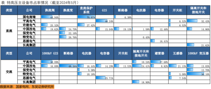 直流工程:换流阀、换流变、直流控保是特高压直流中的核心主设备,格局非常集中,换流阀及直流控保主要以国电南瑞、许继电气以及中国西电为主,换流变主要以中国西电、保变电气、特变电工为主。