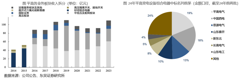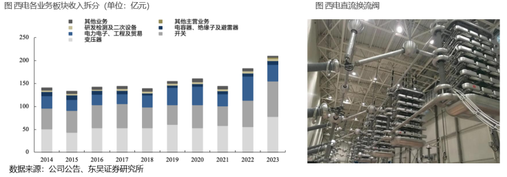 一次设备平台型巨头,产品齐全全环节受益特高压建设。公司专注于输配电设备的研发制造,包括变压器、电抗器、高低压开关、换流阀等电力自动化集成及成套电力设备。2023年国网启动“4直2交”,公司先后中标金上-湖北、宁夏-湖南等特高压项目主设备订单,新签特高压订单约79亿,同比大幅增长。展望2024年,公司换流变、组合电器以及换流阀等核心产品有望在特高压项目中继续获得丰厚斩获。