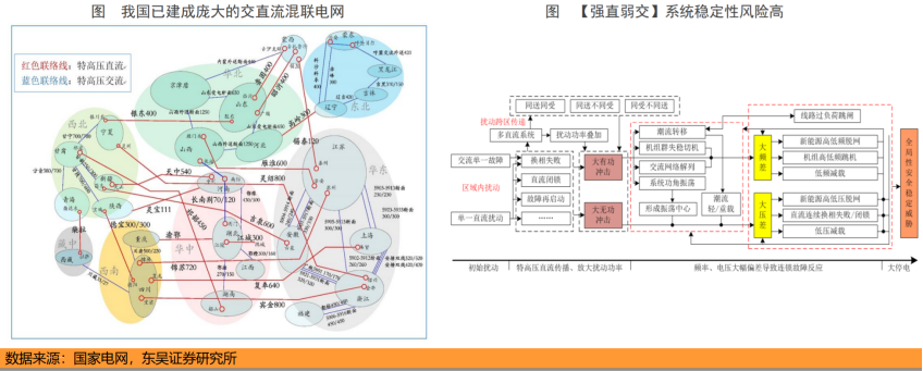 “十四五”和“十五五”密集建设大量新能源占比高的直流外送通道,如何解决【强直弱交】问题成为电网规划的重要方向,我们认为提高柔性直流输电占比和加强特高压交流环网建设两者有望齐头并进。