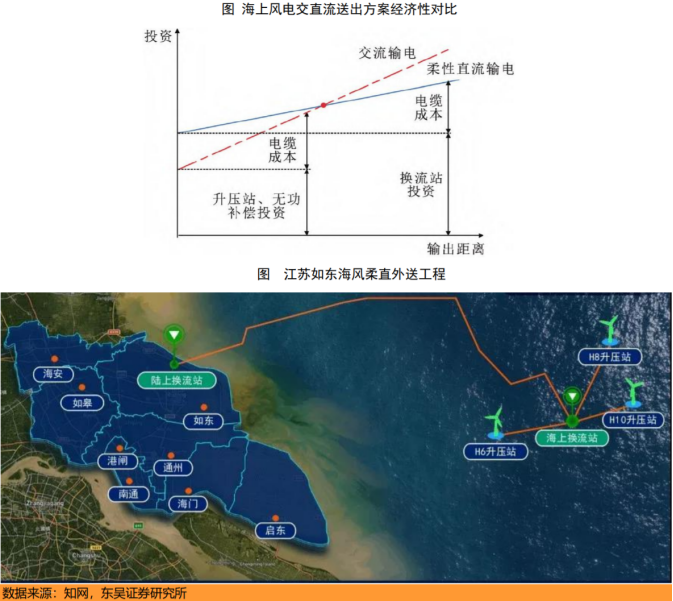 2)风电走向深远海,柔直外送有望成为主流。远距离海上风电场没有办法建设配套的火电等稳定电源,而过长的输电距离交流的投资成本将高于直流,据测算,在2GW传输功率下,交直流等价距离为70kM,所以我们随着深远海风电的增多,柔直外送有望成为主流。