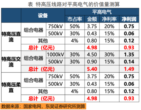平高电气:公司主要以组合电器为核心产品,500/750/1000kV组合电器市占率名列前茅,特高压交流和直流均有大量需求,单直流工程中公司的收入和净利润分别可以达到5.0亿/0.9亿,属于特高压直接受益标的。