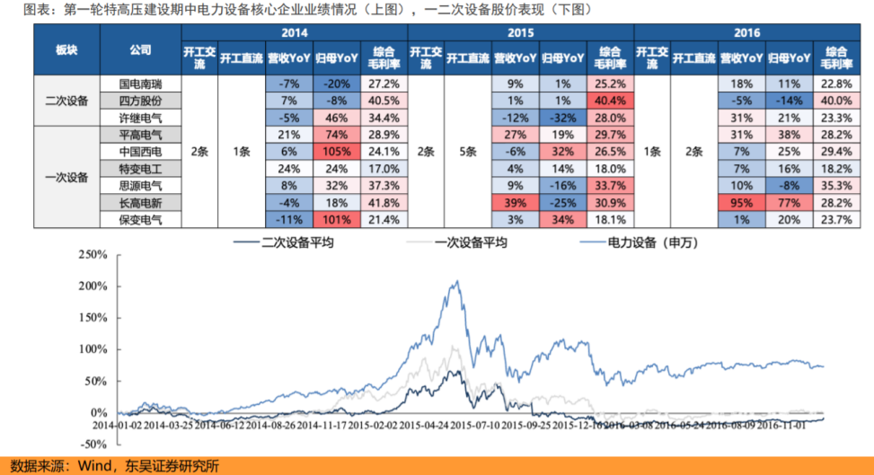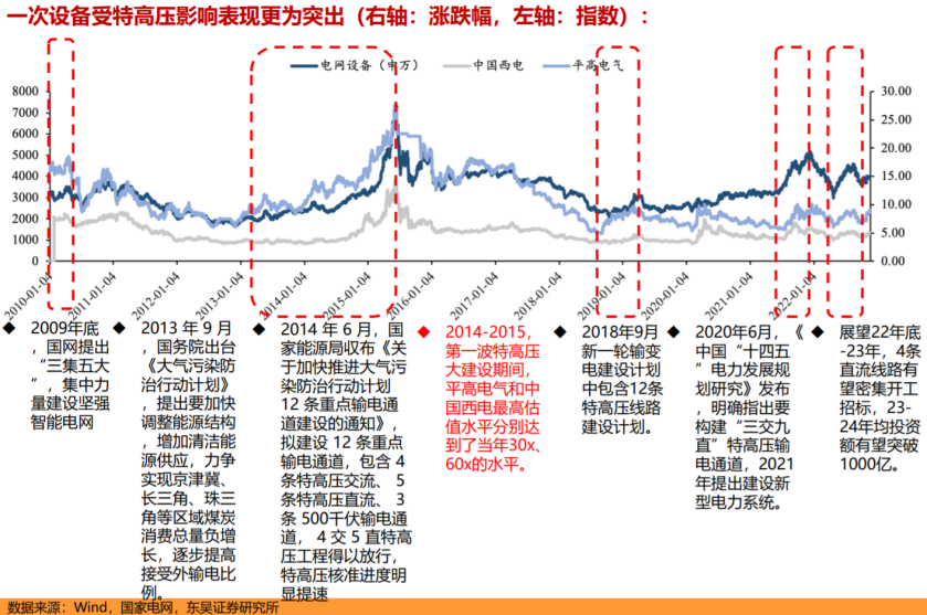 1、第一轮:14-16年大气污染防治开启特高压大规模建设元年,特高压技术自主可控趋势启动+高毛利+工程密集核准开工,龙头标的表现亮眼;2014年大气污染防治计划,自上而下推动特高压通道建设