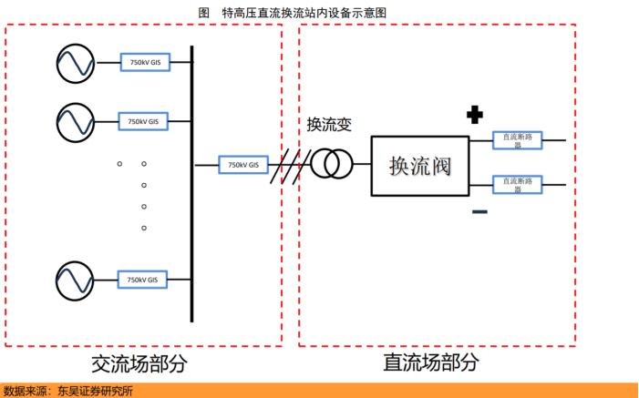 11.特高压直流工程中交流设备是不可或缺的。换流站内从一次设备分区来看可分为交流场和直流场,直流场包含了换流变、换流阀、直流断路器、平波电抗器、直流滤波器和直流控保系统,交流场部分则包含了500kV/750kV组合电器、无功补偿装备、继电保护等交流设备,因此特高压直流中交流设备的用量是刚性的。