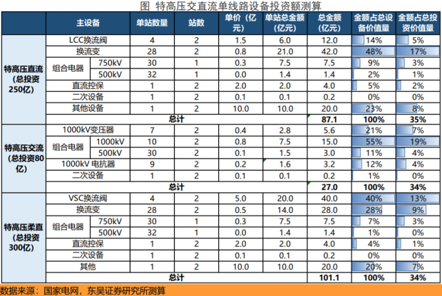 1)常直方面,换流变、换流阀单线价值量最高,分别占总设备价值量的48%/14%,750kV组合电器价值量占比次之,占总设备价值量约9%,这是西北大基地配套外送中的结构性增量。