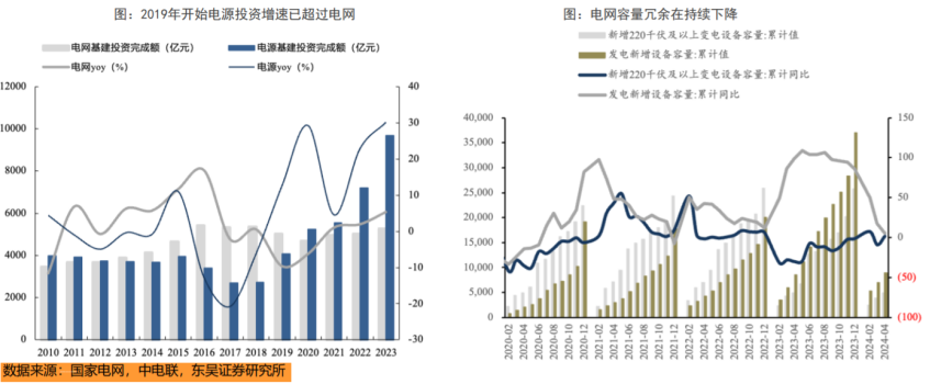 2023年受清洁能源大基地建设提速,新增变电容量开始小于发电设备新增容量,电网冗余度被持续挤压。为了保证后续可靠的新能源的可靠并网+电网稳定,我们预计24-25年电网投资依旧将重点解决大基地外送问题。