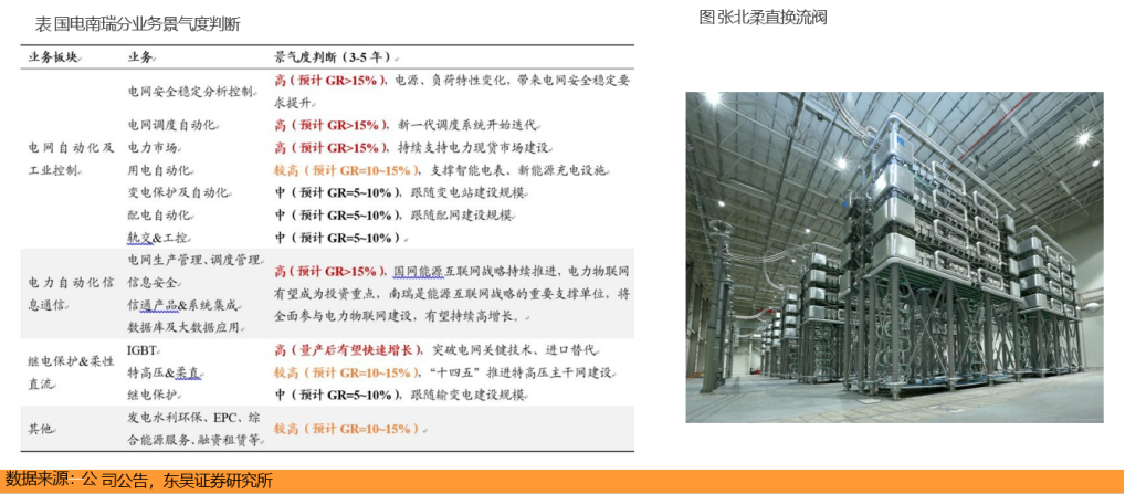 国电南瑞:公司主要是以换流阀以及相关二次设备为主,公司主要受益于特高压直流中换流阀带来的增长,公司份额稳固,柔直带来的增量最大。
