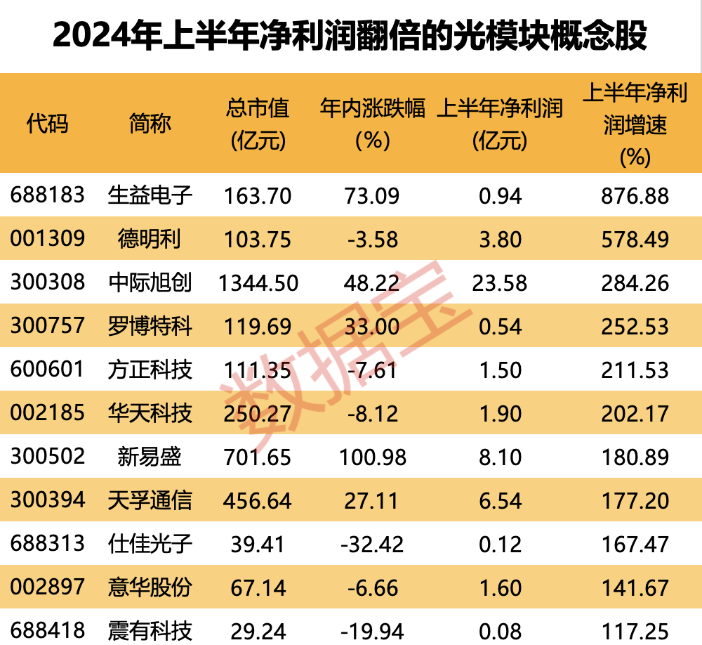 据证券时报·数据宝统计,截至目前,按照半年报、预告净利润下限计算,上半年净利润业绩增长的光模块概念股有23只,其中生益电子、德明利、中际旭创、罗博特科、新易盛、天孚通信等11股净利润翻倍增长。