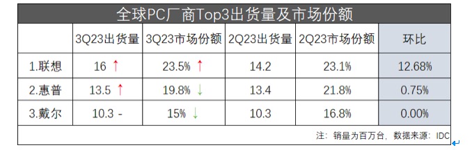 以今日IDC公布的数据为例,相比Q2的环比来看,联想第三季度出货量增加12.67%,市占率提升0.4%;惠普出货量环比基本持平,市占率下跌2%;戴尔出货量环比持平,市占率下跌1.8%。