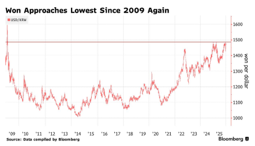 周三,韩元兑美元汇率一度下跌0.25%,触及1美元兑1479.3韩元,不仅连续十个交易日走弱,更逼近2009年3月以来的最低水平。