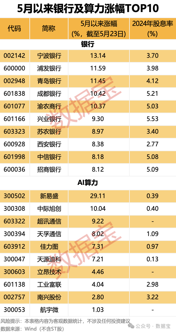 上文提及的银行、AI算力板块中,部分公司跑输大盘,甚至不乏一些优质公司被“错杀”的情形。例如,银行板块中,中国银行、工商银行5月以来(截至5月23日)的涨幅不足1%;根据Wind概念中的AI算力板块来看,近40只个股5月以来股价下跌。