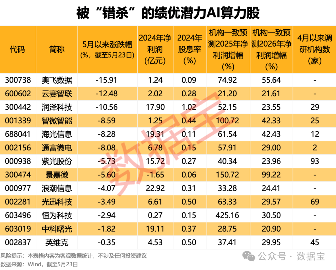 据证券时报·数据宝统计,结合Wind AI算力概念股,5月以来股价下跌、2025年及2026年机构一致预测净利润增幅均超过20%,且2023年、2024年均开展分红(含已宣告)的公司仅有13家。