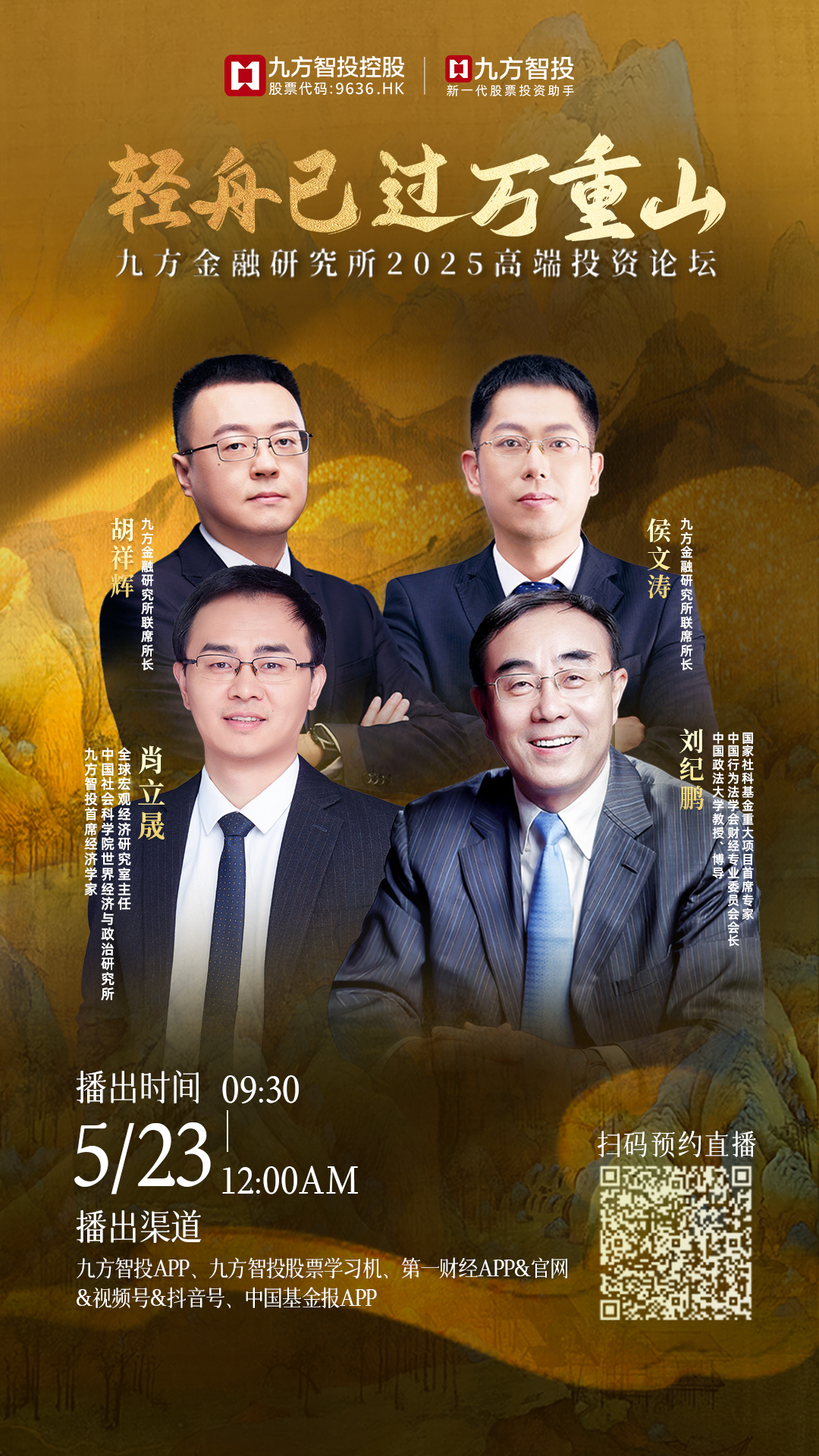 5月23日(周五)9:30-12:00,“轻舟已过万重山”九方金融研究所2025高端投资论坛将通过九方智投APP、九方智投股票学习机、第一财经视频号/抖音号/APP/官网、中国基金报APP等平台同步直播。