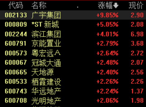 5月9日早盘,房地产开发板块表现活跃。截至发稿,广宇集团涨超9%,滨江集团涨超4%,京能置业、冠城大通、栖霞建设等跟涨。