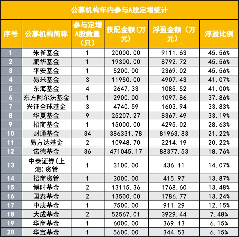 此外,部分中小型基金公司也开始在定增市场中展现存在感。例如易米基金与东海基金,虽参与项目数仅为3至4只,获配金额不足1.2亿元,但其当前浮盈比例均超40%。这从侧面印证了当前定增市场已不再是大型机构的“独角戏”,中小机构亦可凭借灵活机制与精准策略分一杯羹。