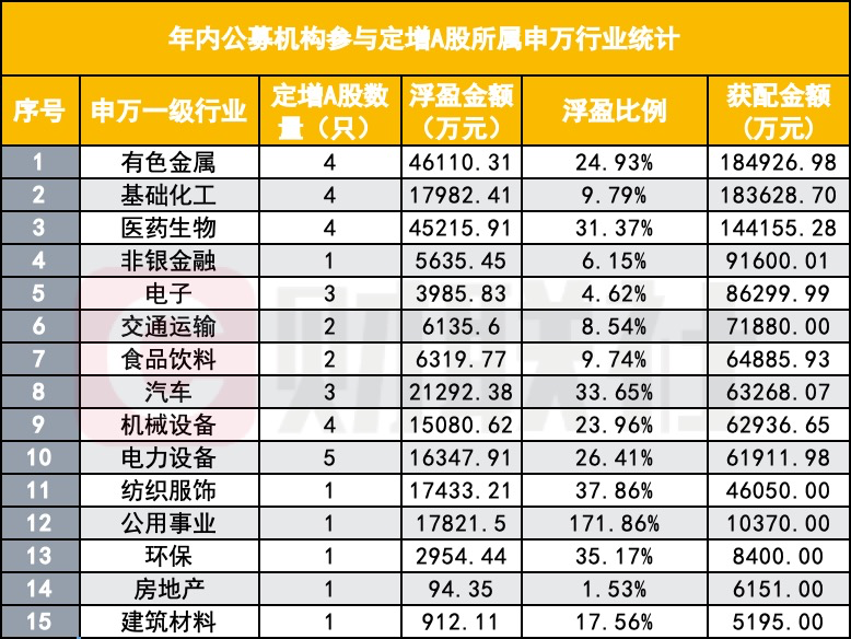 从行业维度来看,今年以来公募机构在定增项目中的“押宝”意图极为明显。有色金属、基础化工和医药生物成为最受追捧的三大板块,合计分别斩获获配金额18.49亿元、18.36亿元和14.42亿元。在这些资金密集配置的背后,是行业阶段性复苏、供需结构优化以及政策支持的多重因素共振。