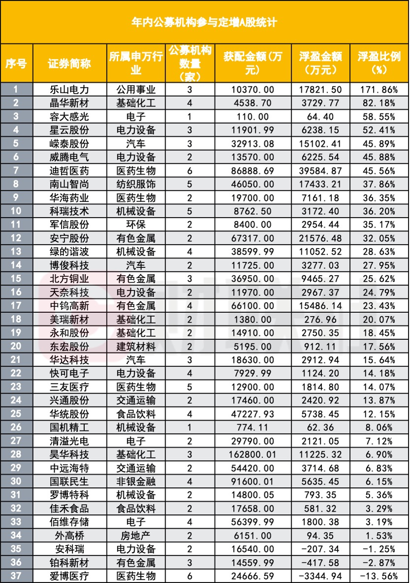 从定增获配数据可以看到,公募不仅在大宗项目中保持活跃,甚至在部分小市值标的上也不吝下重注。例如乐山电力,该项目获配金额仅为1.04亿元,但目前已实现浮盈1.78亿元,浮盈率高达171.86%,成为本轮公募定增战中最亮眼的“样本”。