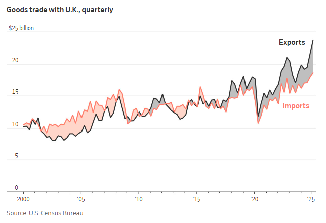 英国作为主要的北欧石油贸易中心,在2024年,美国向英国出口了约147亿美元的石油、天然气和各种矿物燃料,约占对英出口额的18%。