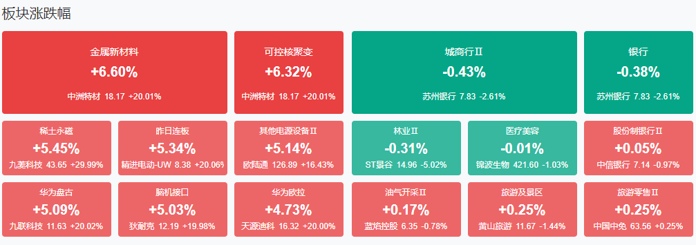 板块方面,可控核聚变、稀土永磁、鸿蒙、CPO等板块涨幅居前,银行等少数板块下跌。截至收盘,沪指涨1.13%,深成指涨1.84%,创业板指涨1.97%。