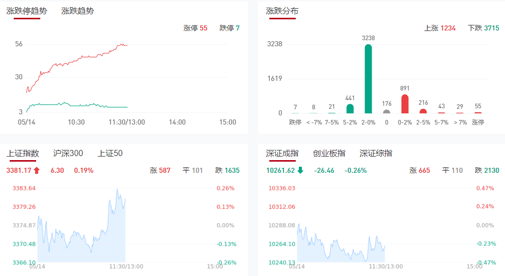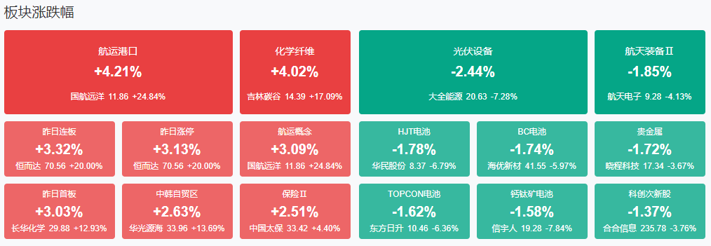 市场早盘震荡分化,三大指数涨跌不一。沪深两市半日成交额7169亿,较上个交易日缩量1671亿。盘面上热点较为杂乱,个股跌多涨少,全市场超3800只个股下跌。从板块来看,港口航运股维持强势,宁波海运等涨停。化工股反复活跃,红墙股份等多股涨停。保险、银行等大金融股震荡走强,农业银行等多股再创历史新高。下跌方面,光伏概念股集体调整,东方日升等跌超5%。