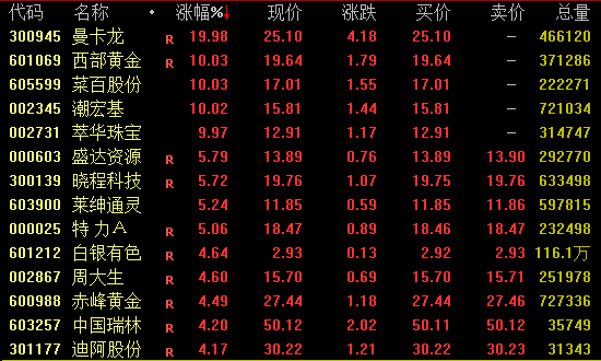 黄金概念盘中发力走高,截至收盘,曼卡龙、西部黄金、菜百股份、潮宏基等涨停,赤峰黄金涨超4%。