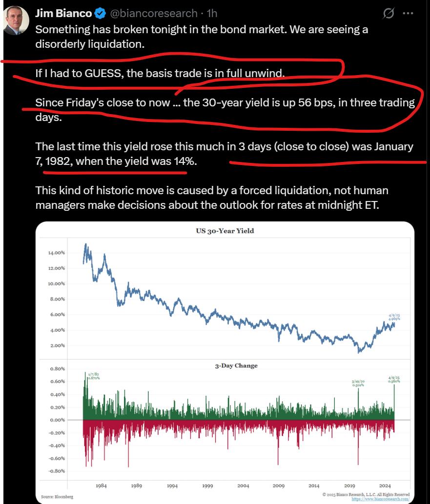 特朗普政府所谓的"静默模式"正在显效——他们任由市场阵痛蔓延。由于美国政府对贸易伙伴的强硬立场,引发了真正的买家罢工,从而引发了恐慌,已使美债市场陷入需求真空。周二收盘时美债的壮观崩盘让众多从业者(包括我本人)持续质疑市场理性——收益率曲线急剧熊市陡峭化,各类利差、基差等指标全面崩溃。