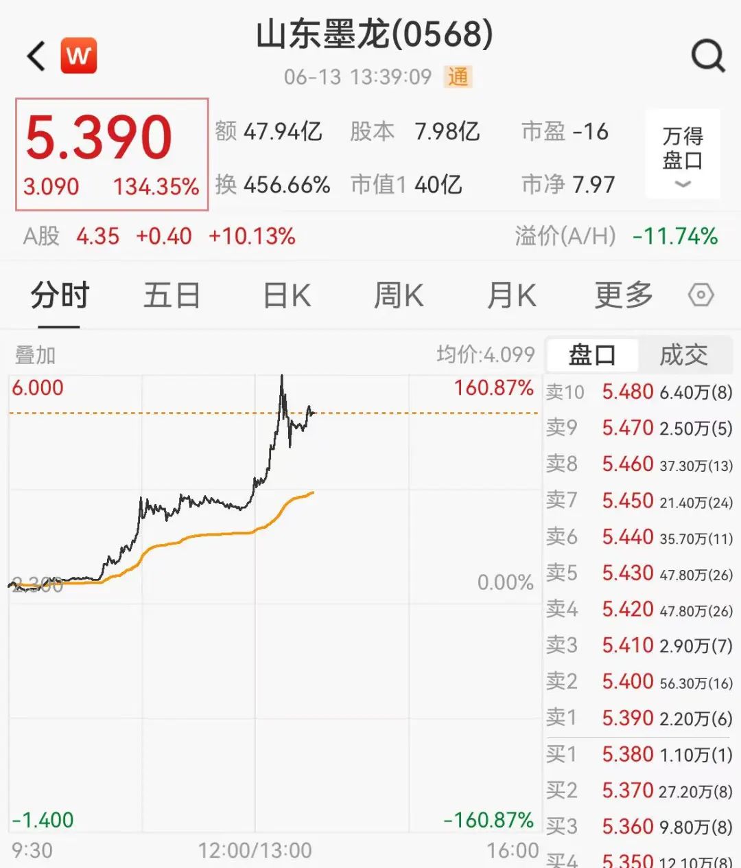 山东墨龙一度涨超160%。