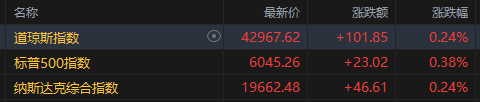 截至收盘,道琼斯指数涨0.24%,报42,967.62点,为3月6日以来的最高水平;标普500指数涨0.38%,报6,045.26点,为2月21日来新高;纳斯达克综合指数涨0.24%,报19,662.48点。