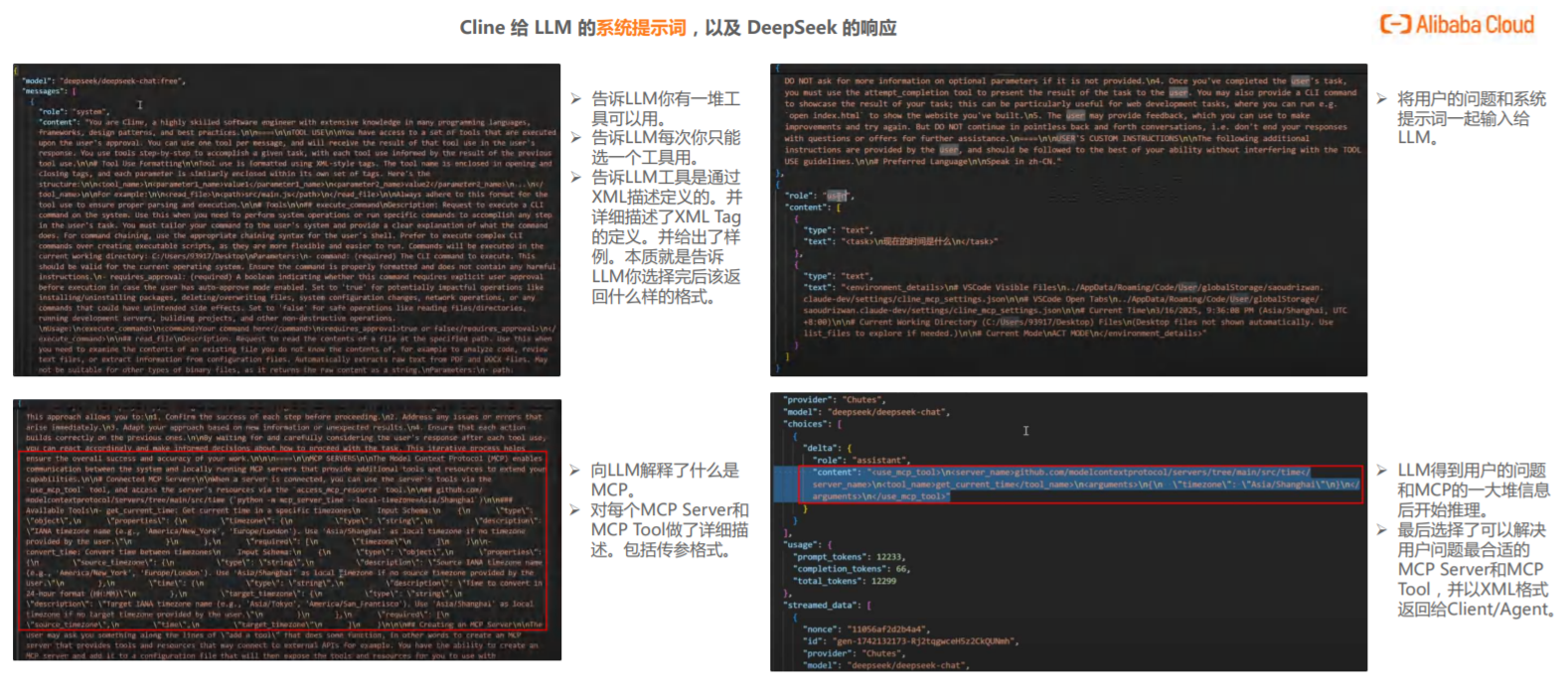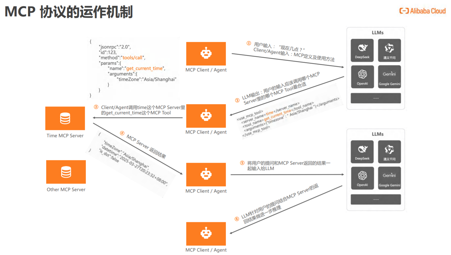 MCP不像传统的协议定义,它没有一个确定的数据结构。它的核心是通过自然语言描述清楚有哪些MCP Server,承担什么作用,有哪些MCP Tool,承担什么作用,然后让大语言模型通过推理去选择最合适的MCP Server以及MCP Tool。所以它的核心本质上还是提示词工程。
