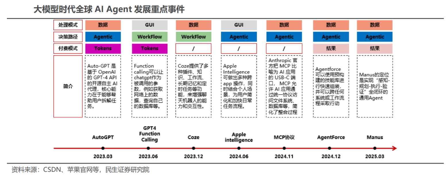 (2)加速 Agent 最后一公里。一方面,MCP显著降低Agent开发门槛,提升部署效率,如阿里云百炼平台通过MCP实现快速搭建专属Agent的能力,用户无需管理资源、开发部署、工程运维等工作,5分钟即可快速搭建一个连接MCP服务的Agent;另一方面,多 Agent的协同离不开统一标准,今年3月,Manus的火热掀起了新一轮关于协议标准的讨论。虽然Manus并未直接采用MCP协议,但这一应用让业界看到了多Agent协同的想象力,协同的核心就是标准协议。