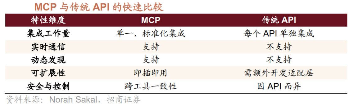 MCP相比于传统API可简化AI集成,显著降低开发门槛:MCP与传统API之间的主要区别体现在: