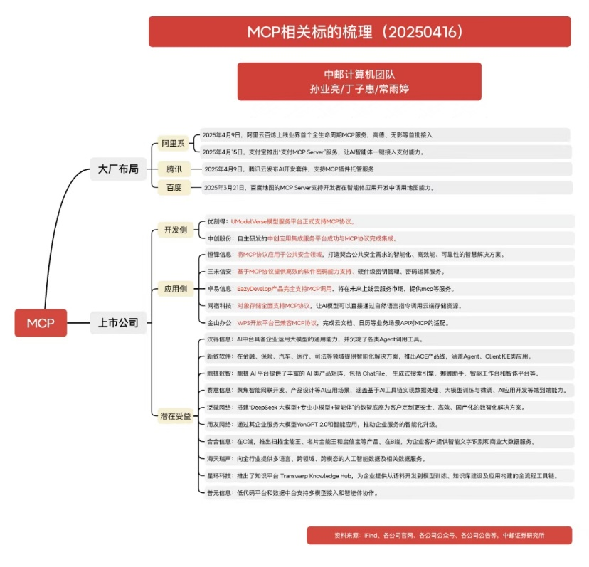 事件:阿里云、谷歌、腾讯等企业相继宣布支持MCP协议,阿里云百炼平台上线业界首个全生命周期MCP服务,首批集成高德、无影等50余款工具;谷歌宣布为Gemini模型添加MCP支持,腾讯云则升级大模型知识引擎,支持调用MCP插件。
