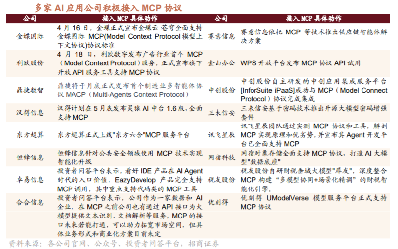 点评:MCP的使用有望提升AI智能体开发效率和商业化落地速度。多家互联网巨头支持MCP,AI智能体商业化落地有望加速。