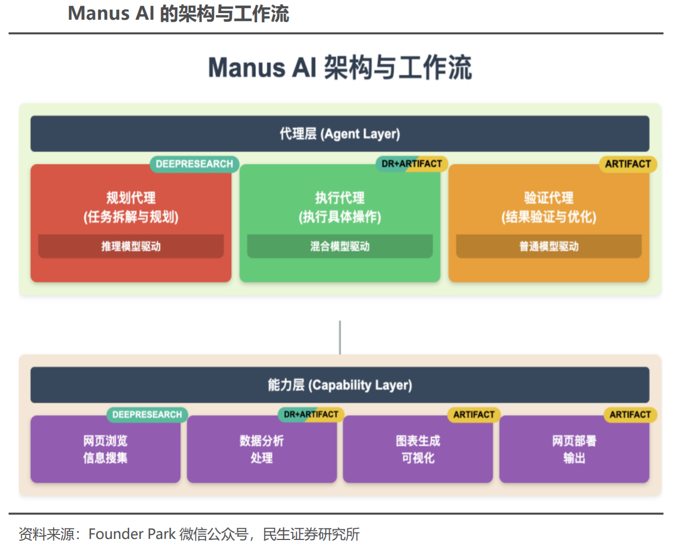 Manus或是采用类MCP协议+Agentic-based路径的集大成作。据Founder Park微信公众号,Manus AI或使用一套名为“Multiple Agent”的架构,运行在独立的虚拟机中。通过规划代理、执行代理、验证代理的分工协作机制,来大幅提升对复杂任务的处理效率,并通过并行计算缩短响应时间。在这个架构中,每个代理可能基于独立的语言模型或强化学习模型,彼此通过API或消息队列通信。同时每个任务也都在沙盒中运行,避免干扰其他任务,同时支持云端扩展。每个独立模型都能模仿人类处理任务的流程,比如先思考和规划,理解复杂指令并拆解为可执行的步骤,再调用合适的工具。