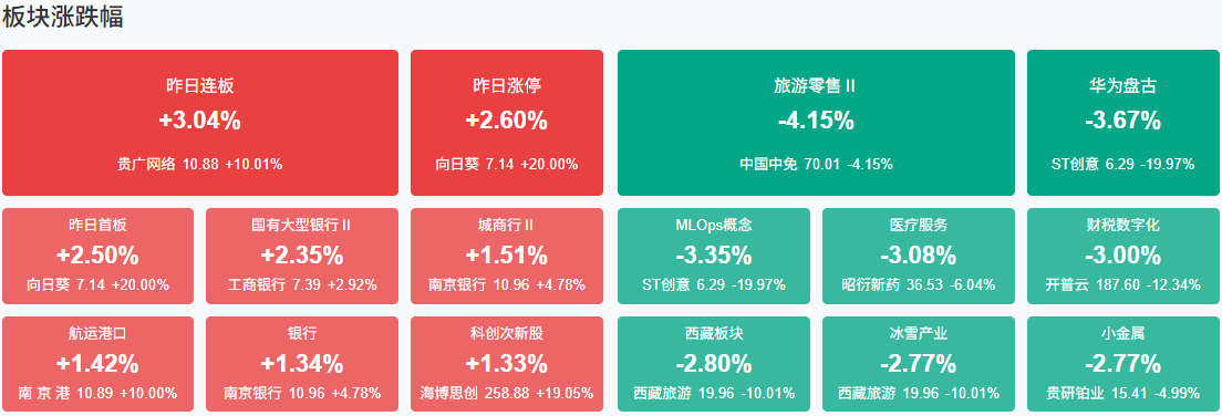 板块方面,港口航运、银行等板块涨幅居前,旅游、华为、小金属等板块跌幅居前。截至收盘,沪指跌0.18%,深成指跌0.29%,创业板指涨0.21%。