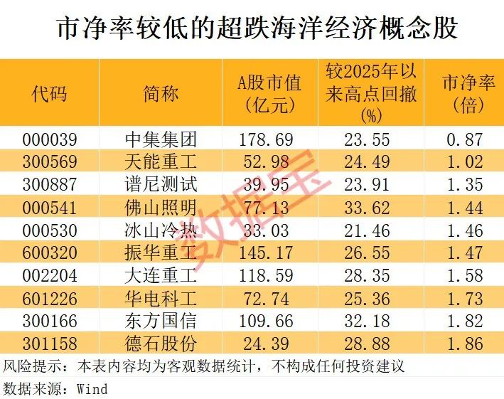 回撤幅度超20%的海洋经济概念股中,截至今日收盘,10股市净率(PB)低于2倍,如中集集团、天能重工、谱尼测试、佛山照明、冰山冷热等。