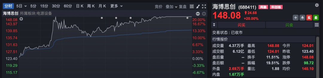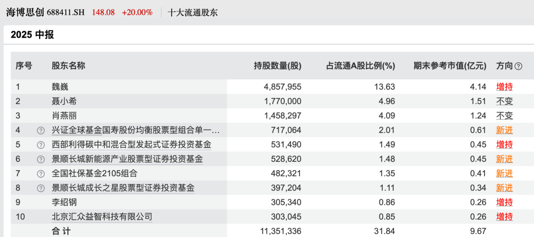 海博思创临近收盘20%涨停。2025年半年报显示,截至6月末,兴证全球基金国寿股份均衡股票型组合单一资产管理计划新进成为海博思创第四大流通股股东,西部利得碳中和混合型发起式证券投资基金新进成为第五大流通股股东,景顺长城新能源产业股票型证券投资基金、汇添富社保基金2105组合、景顺长城成长之星股票型证券投资基金也分别新进成为第六、第七、第八大流通股股东。