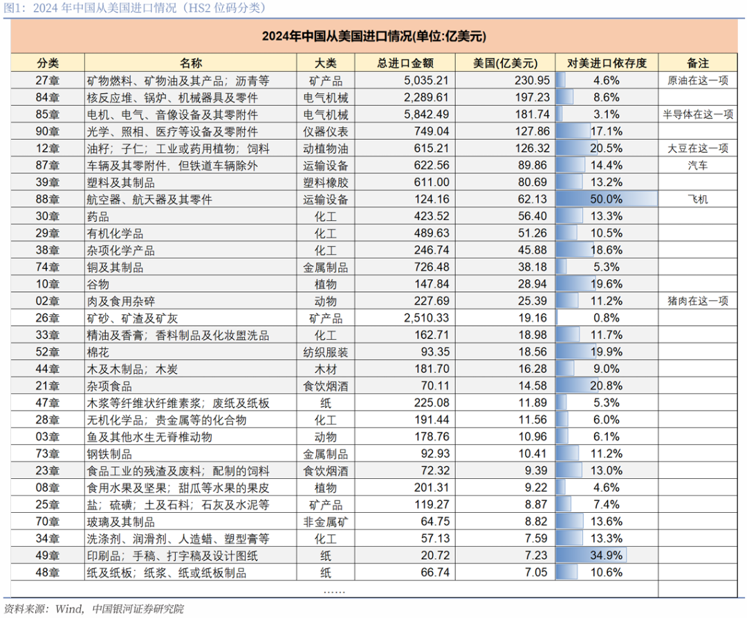 根据银河证券研报,中国对美进口商品依存度最高的是运输设备领域的航空器、航天器及其零件,依存度达到50%,对美进口依存度超过20%的还包括动植物油、食饮烟酒、纸等。从金额维度来看,2024年自美进口商品中金额超过百亿美元的主要集中在矿产品、电气机械、仪器仪表、动植物油等方面。