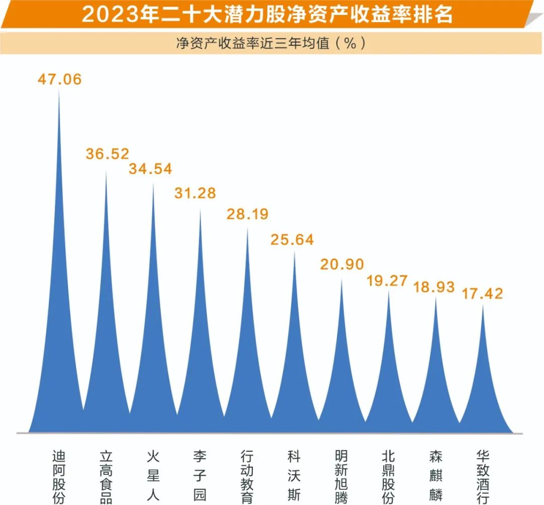 整体而言,二十大潜力股多为盈利能力较好的白马股。证券时报·数据宝统计,二十大潜力股2019年至2021年净资产收益率平均值的中位数超17%,大幅超出A股整体水平。潜力股中,迪阿股份、立高食品、火星人等7只个股三年净资产收益率平均值超过20%。