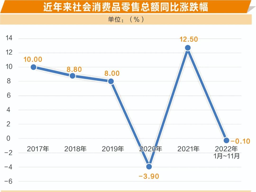 国家统计局数据显示,2022年11月份社会消费品零售总额38615亿元,同比下降5.9%。其中,除汽车以外的消费品零售额34828亿元,下降6.1%。总体来看,2022年1月~11月社会消费品零售总额同比下降0.1%。继2020年后,2022年较大可能全年社会消费品零售总额再度出现同比下降。