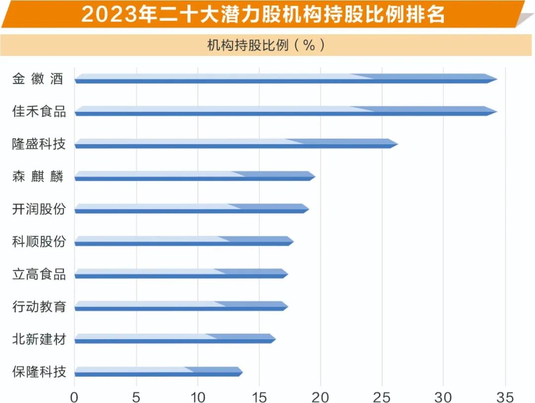 综合来看,机构持有二十大潜力股持股比例(不含一般法人)平均为15%,控盘比例相对较高;其中,金徽酒、佳禾食品等机构控盘比例超过三成,隆盛科技超两成。