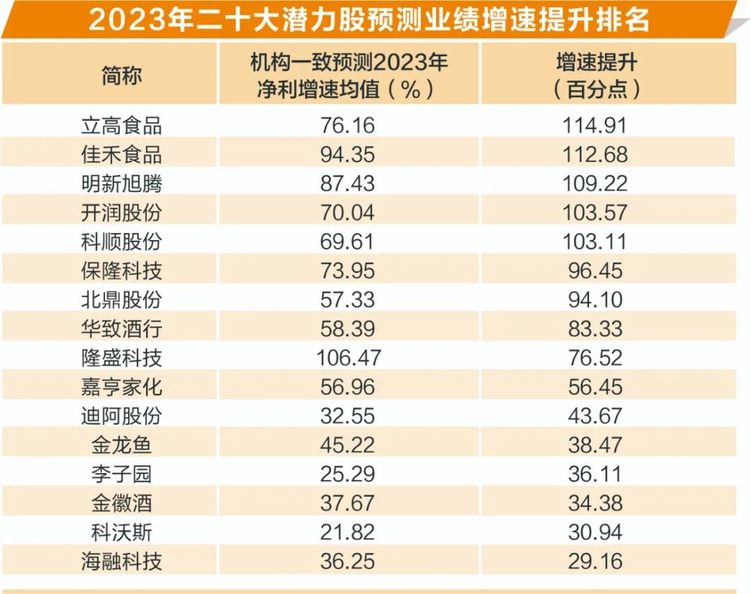 具体来看,机构一致预测隆盛科技2023年净利增速超过106%,相比2022年提升近77个百分点。另外佳禾食品、明新旭腾、立高食品、保隆科技、开润股份等个股机构一致预测2023年净利增速均超70%。从净利增速提升情况来看,机构一致预测立高食品、佳禾食品、明新旭腾、开润股份、科顺股份等个股2023年净利增速相比2022年提升均超100个百分点。