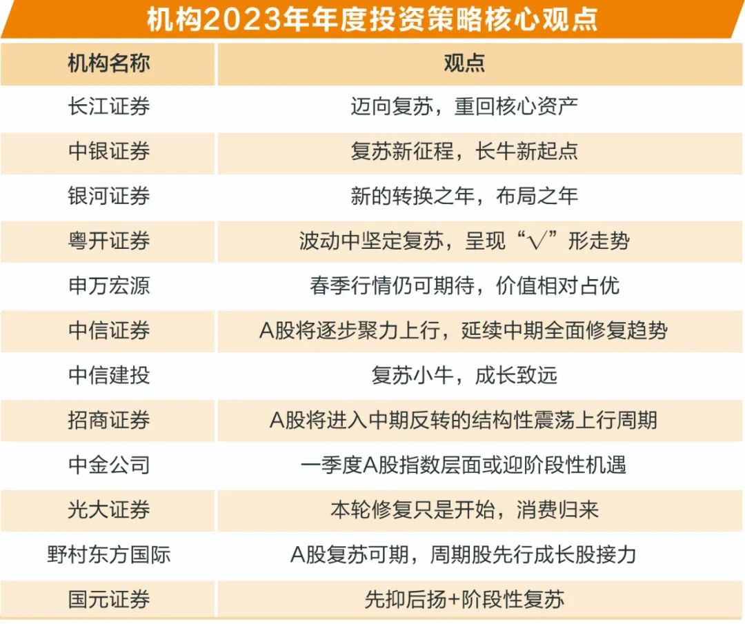 “复苏”被机构反复提及,堪称年度策略关键词。国元证券认为“先抑后扬”和“阶段性复苏”可能是2023年的A股特征。长江证券表示,阶段性的地产、消费强复苏环境下将较大程度上催化市场对全面复苏的预期,2023年最大的配置主线将回归到核心资产。
